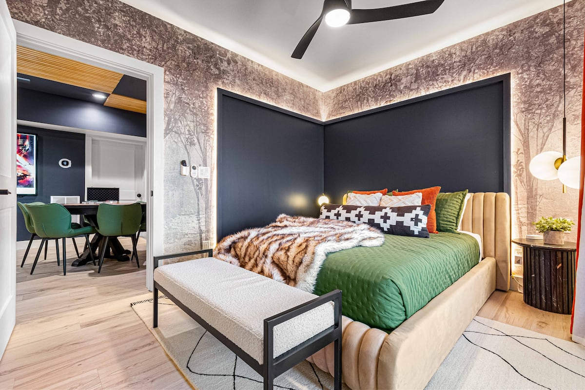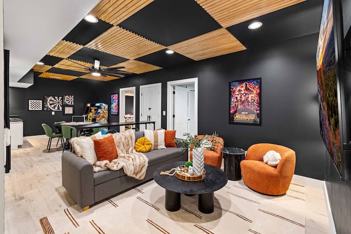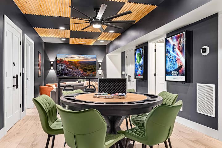 Enjoy a luxury retreat with two game rooms including a pool table, table tennis, stand up arcade games, professional poker table and movie room. Melt away in the 6-person hot tub, 4 person barrel steam sauna or the fire pit with beautiful mountain views. A chef-ready kitchen, deluxe coffee and tea bar and soaking tub with wine table in the master await you. Enjoy together time with alfresco dining for 10 with outdoor propane grill on the top deck. This professionally designed modern home sleeps 10 across three bedrooms plus a sleeper sofa. Other top notch amenities include 1G high-speed Wi-Fi, EV charger, accessible ramp, filtered water, washer/dryer, dedicated workspace and full safety features.