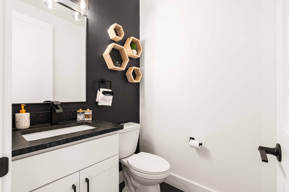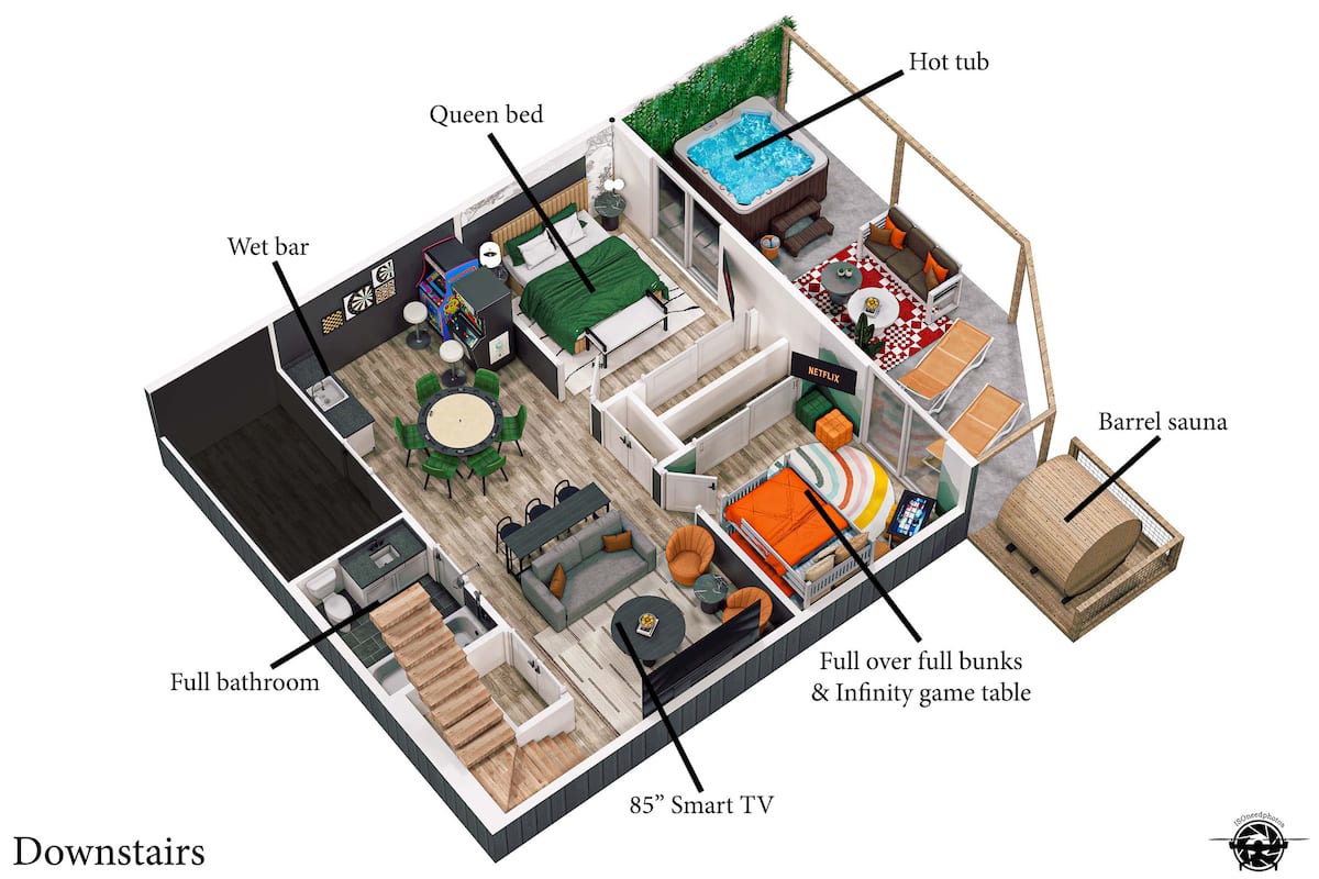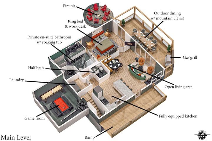 Relax at Everview a cozy, professionally designed modern mountain escape with two game rooms, hot tub, sauna, fire pit seating 7 and space to comfortably sleep 10.