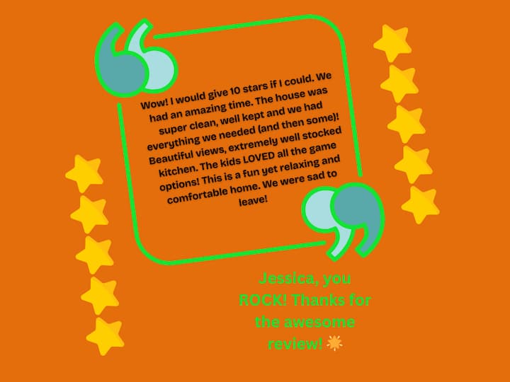 Our family LOVED this home and all it's family friendly amenities! The place is exactly as pictured and we made memories to last a lifetime. The view is beautiful, the beds are cozy, the hot tub was clean, and all the games for the kids kept them entertained when we weren't out and about. Greg is a fantastic host and shows he truly cares with all the extra touches and excellent communication. We hope to return one day!